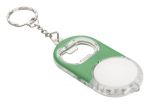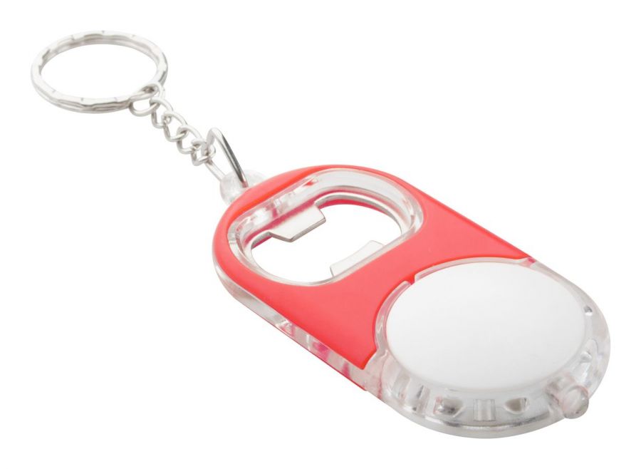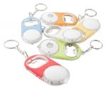 Plastikowy otwieracz do butelek z diodą LED i metalowym kółkiem. W zestawie z bateriami.